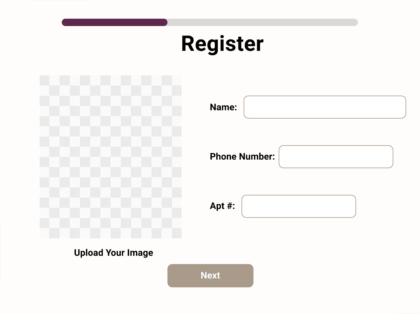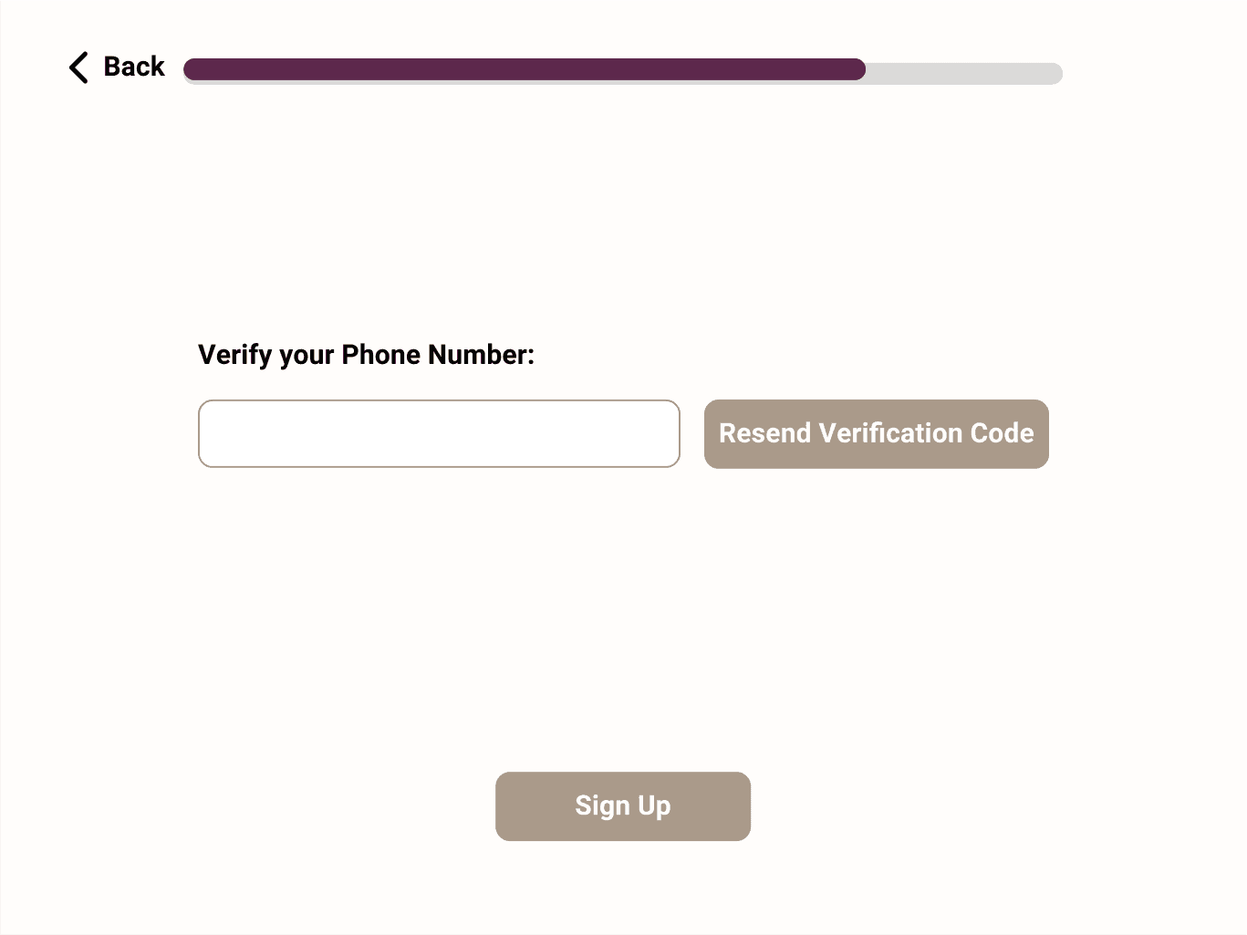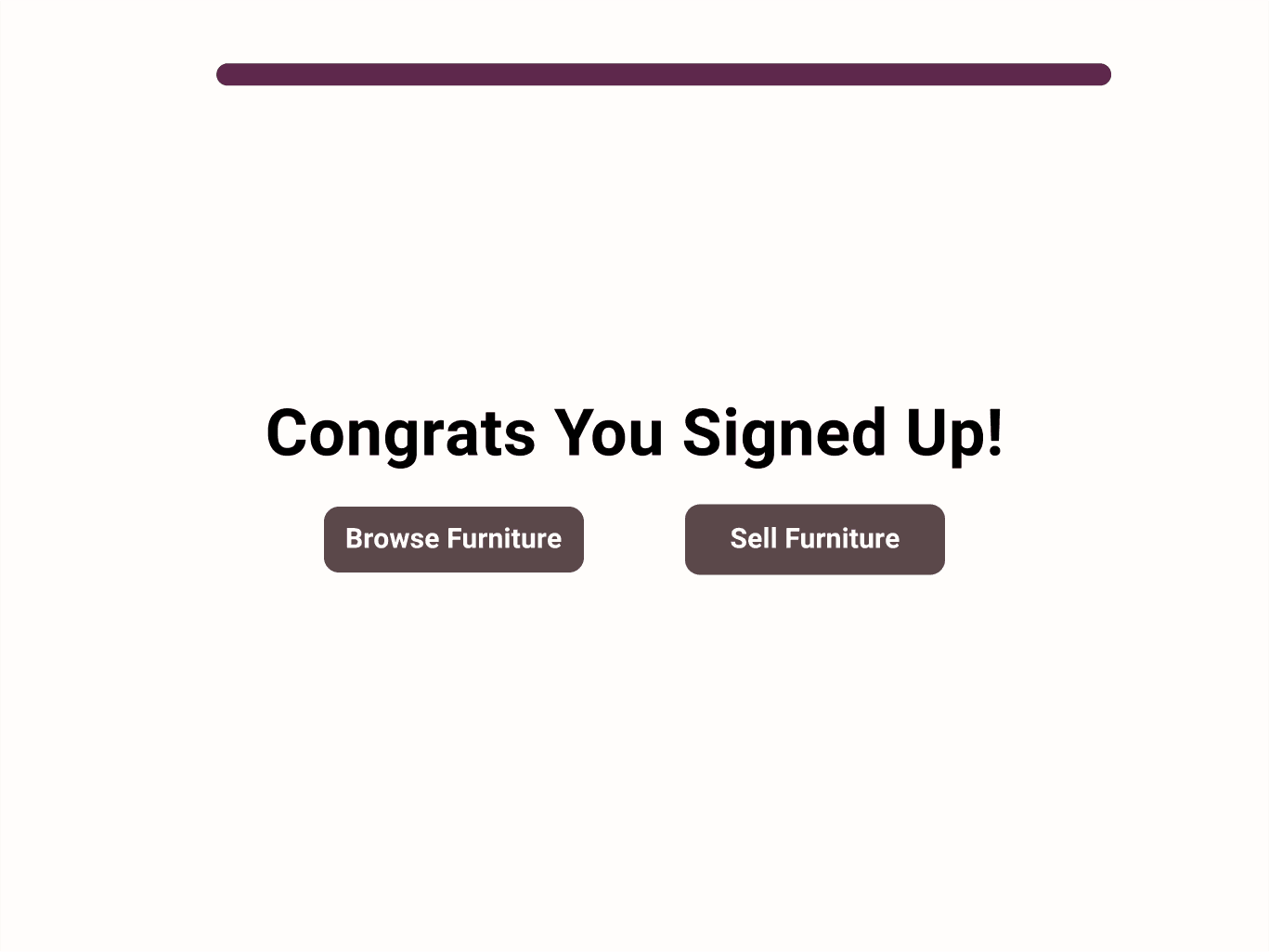 The registration process is shown the first time to allow users to save furniture, create a point of contact, and verify their status as an apartment resident. Users verify their phone number during sign-up, and once registered, they can browse or sell furniture.