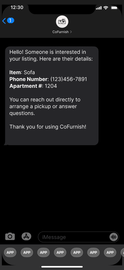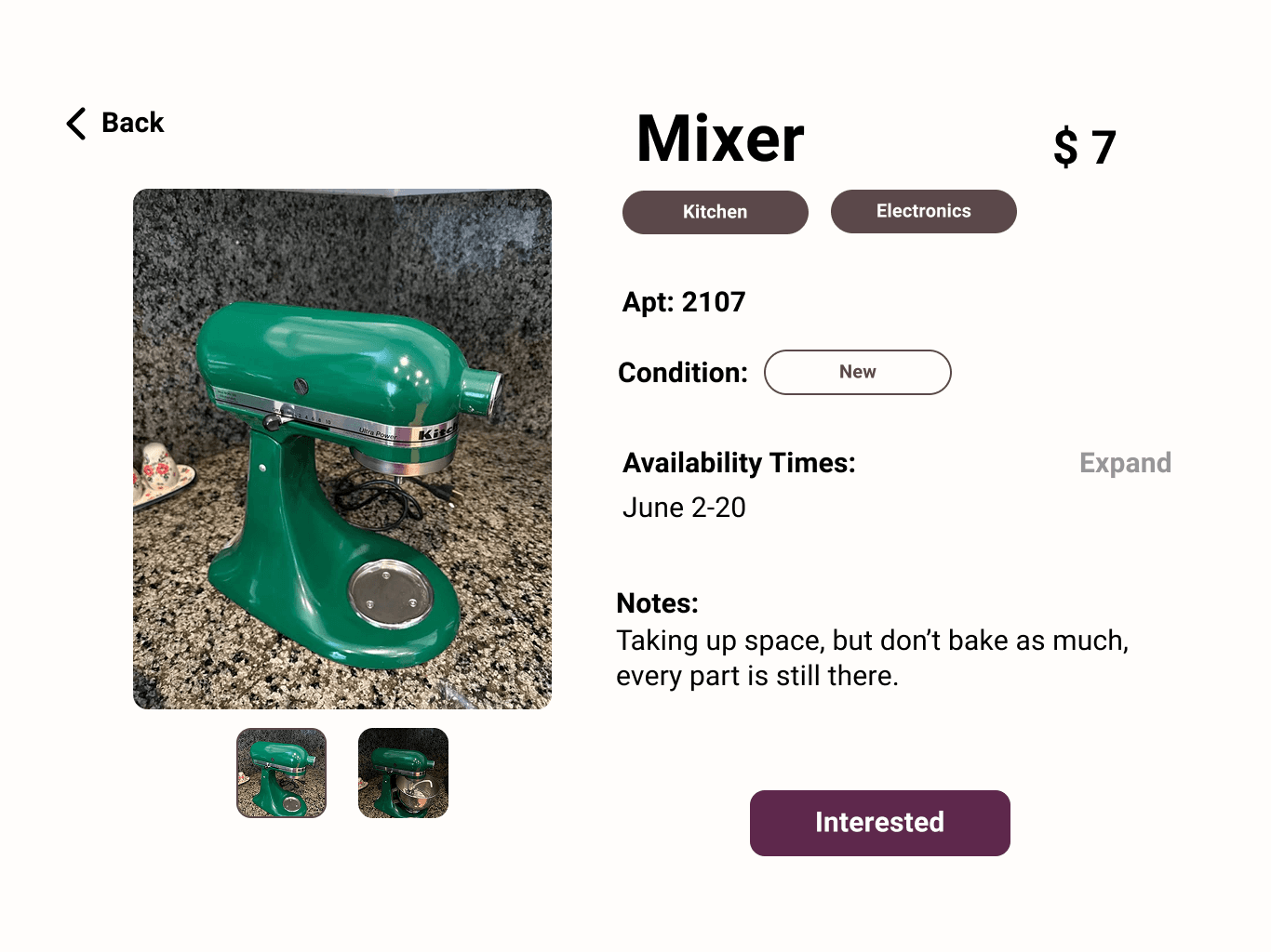 We included seller information to ensure the validity of each listing and confirm that the seller is a verified apartment resident. This adds a layer of safety and trust to the process. Buyers can view the seller's contact information, such as a phone number, and see how many other people are interested in the same item.