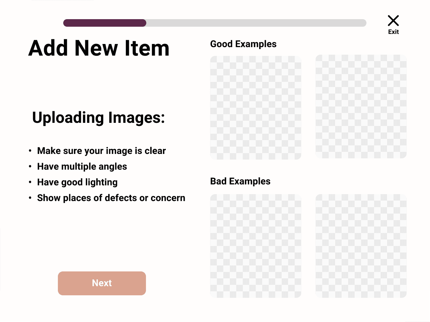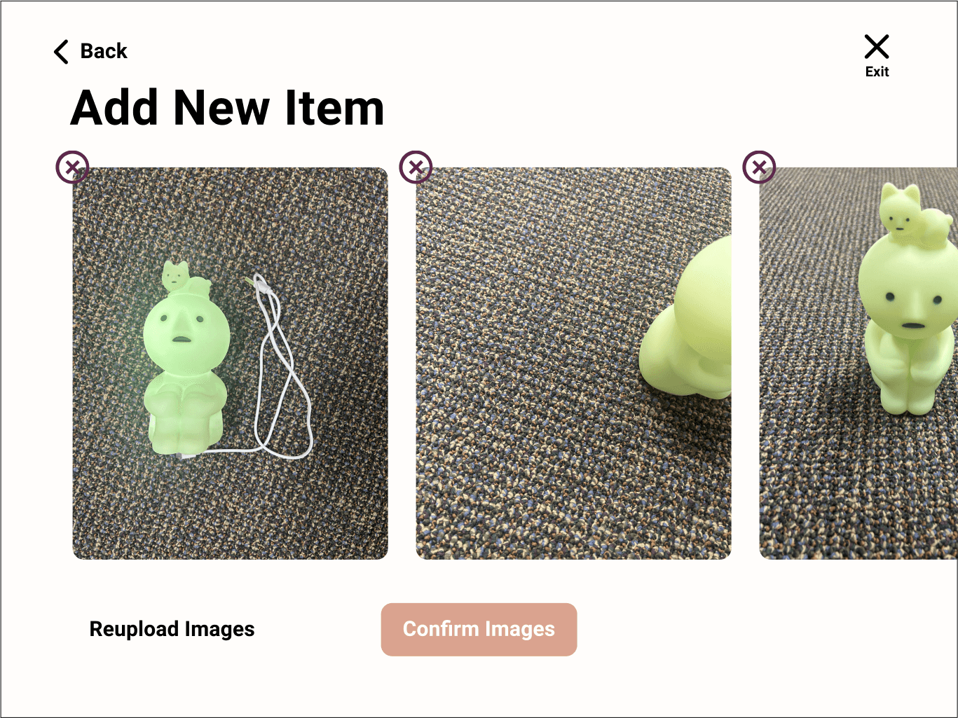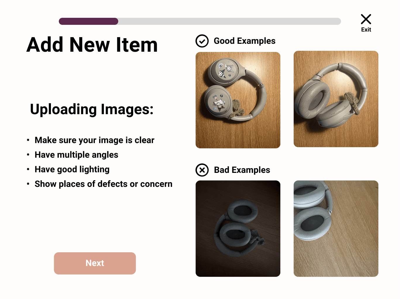 When users want to sell their own furniture, they can upload images, add descriptions, and save their listing. During the process, they can view photo examples to check quality, remove or change images, and navigate back to previous pages to edit their listing before finalizing.