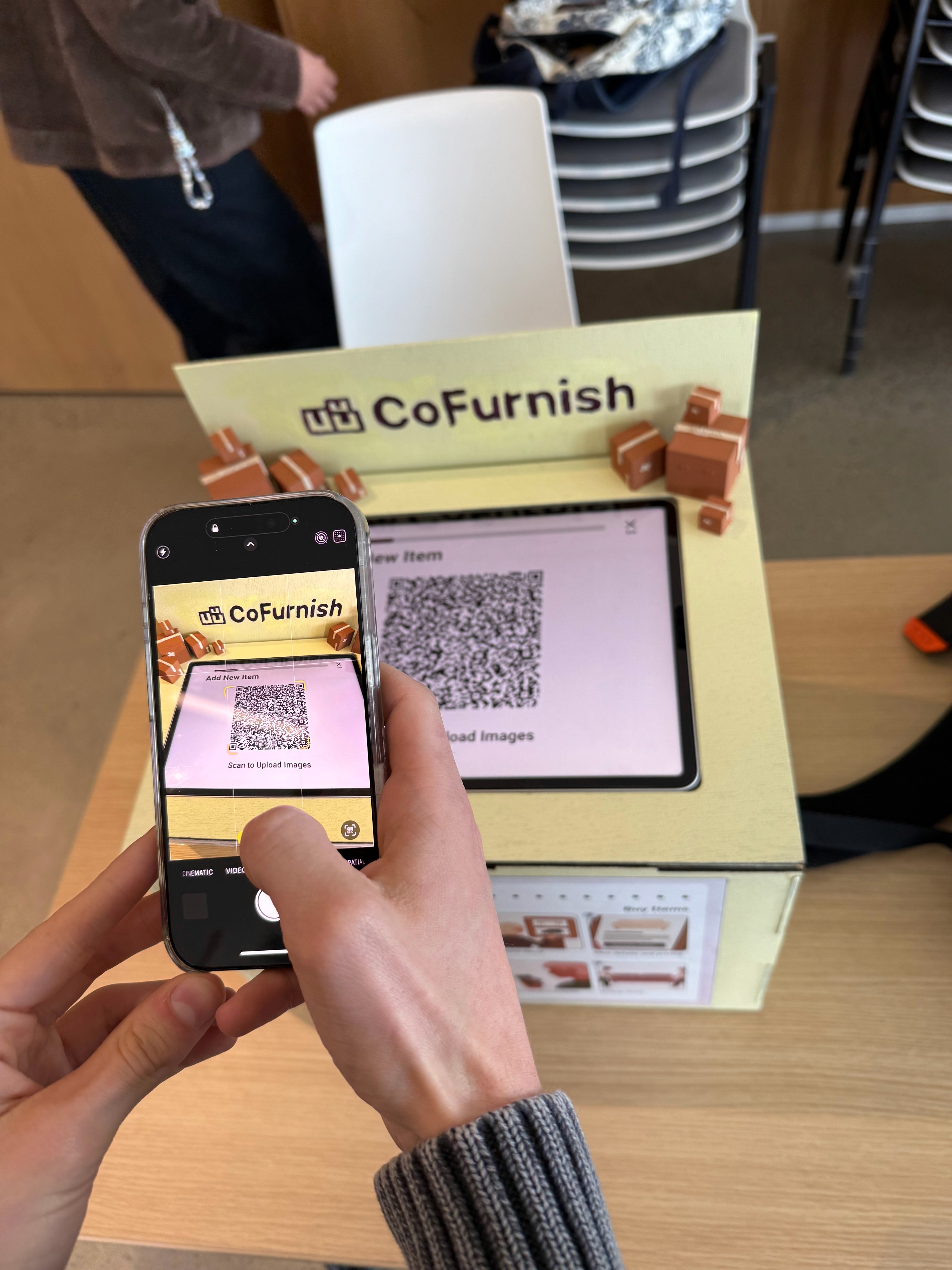 One of the main problems we needed to solve was increasing user interaction with the kiosk. We addressed this by allowing users to connect their phones—scanning QR codes to upload images and receiving real text message notifications from the Cofurnish kiosk.