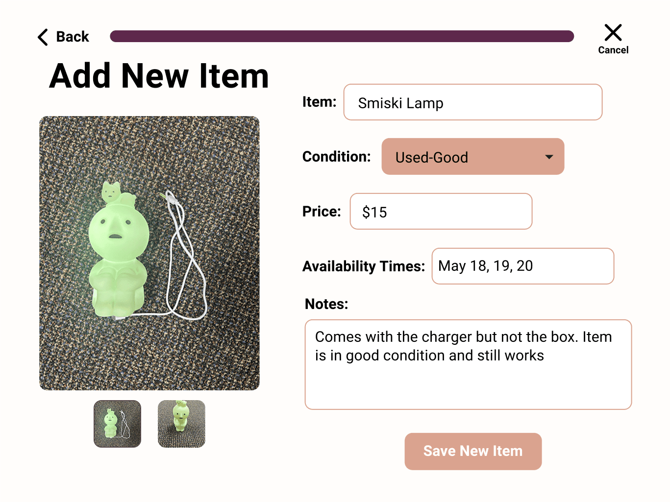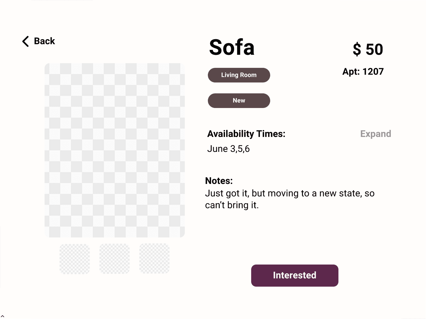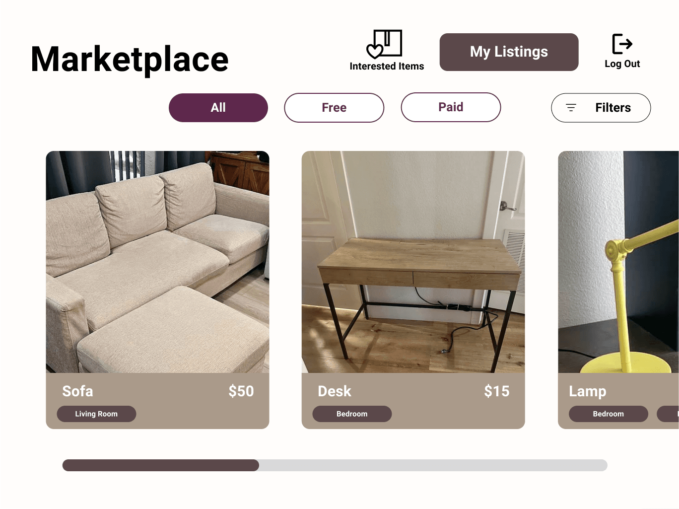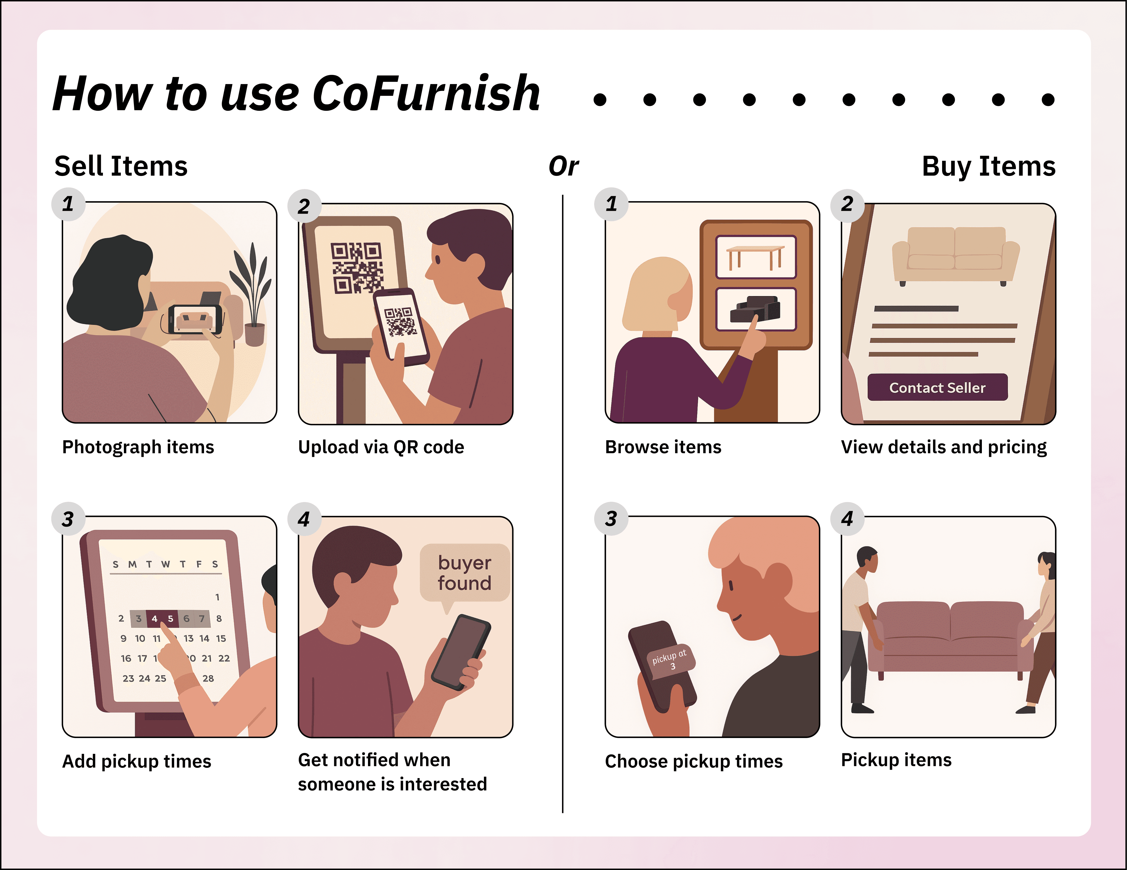 To address Alice’s pain points, our solution enables residents to easily browse available furniture within their apartment complex, list items they no longer need, and connect with others for quick, local exchanges—removing the stress of transportation, coordination, and last-minute moving needs.