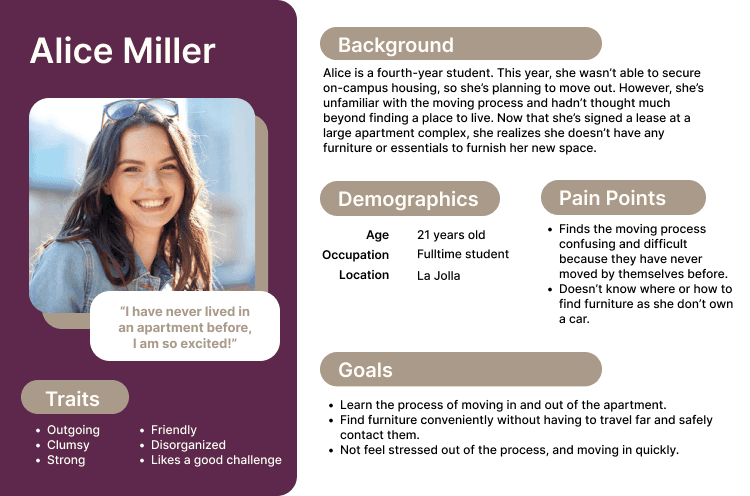 Our primary user persona graphic, describing Alice Miller’s characteristics, needs, and frustrations.