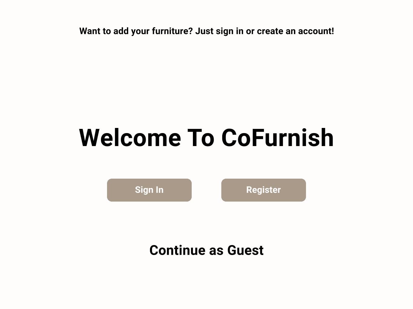 When users first interact with the kiosk, they see a landing page with automatically rotating furniture items. From there, they can choose to sign in, then proceed to either browse or sell furniture.